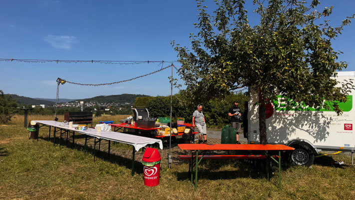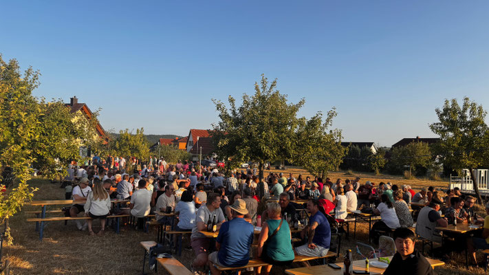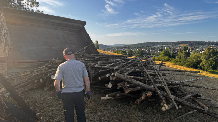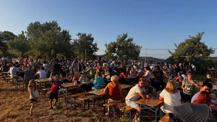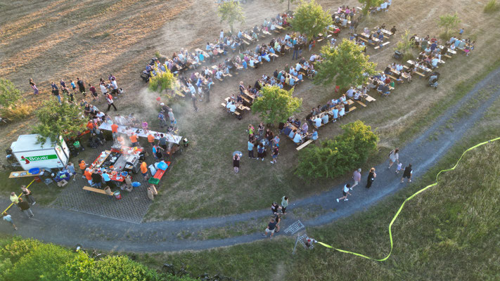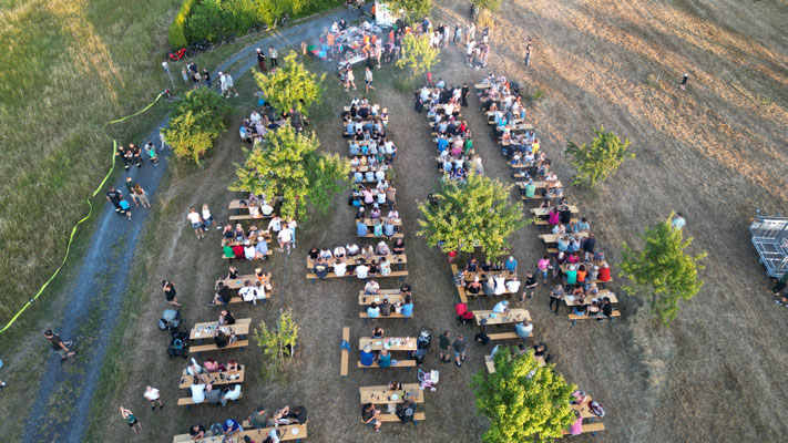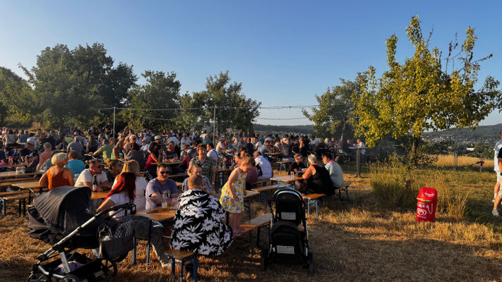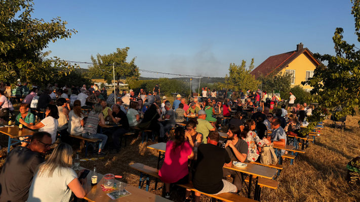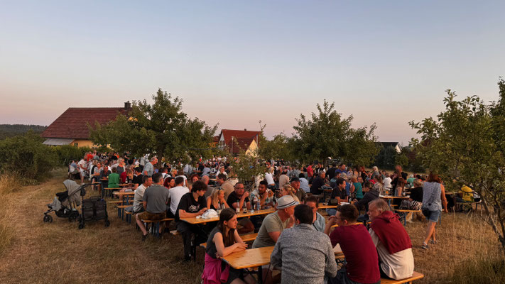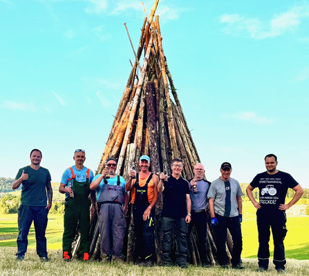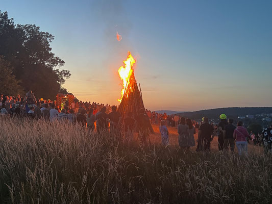 Bei strahlendem Sonnenschein und sonnigen Temperaturen fand dieses Jahr mehr Gäste als je zuvor den Weg rauf zur Streuobstwiese - zu unserem Sonnwendfeuer. Der Scheiterhaufen war wieder hoch gebaut und die Gefahr für Wiesen-Brand war wieder recht hoch.